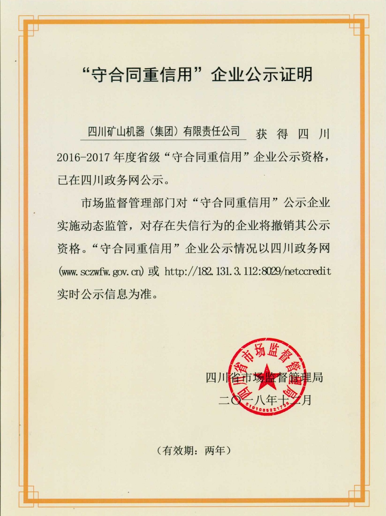 日前,四川省市場(chǎng)監(jiān)督管理局向社會(huì)公示了1294戶2016-2017年度省級(jí)“守合同重信用”企業(yè),我公司連續(xù)數(shù)年上榜。
